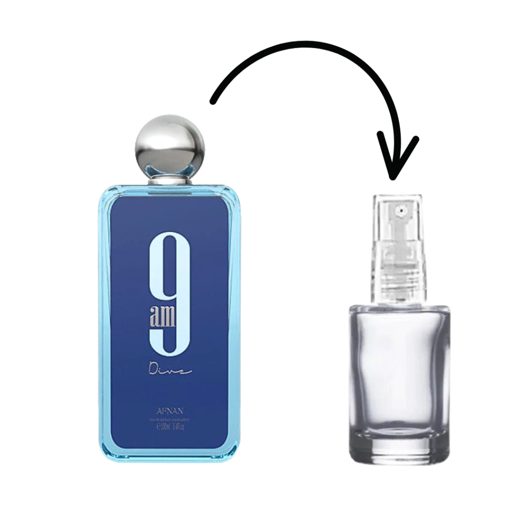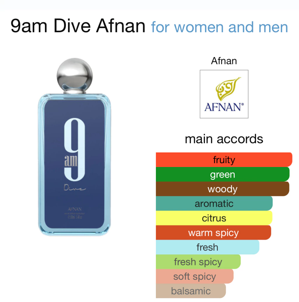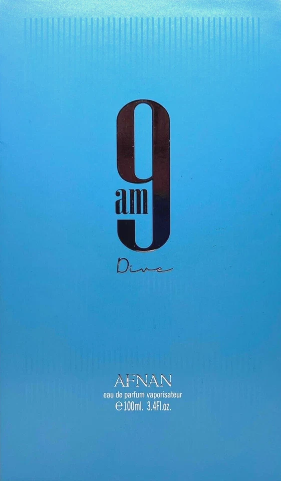 9am Dive de Afnan é um perfume Aromático Aquático Compartilhável. 9am Dive foi lançada em 2022. O perfumista que assina esta fragrância é Imran Fazlani. As notas de topo são: Limão, Hortelã, Groselha Preta e Pimenta Rosa. As notas de coração são: Maçã, Cedro e Incenso. As notas de fundo são: Gengibre, Sândalo, Patchouli e Jasmim.