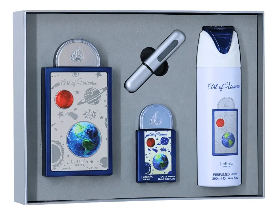 Art Of Universe de Lattafa Perfumes é um perfume Cítrico Aromático Compartilhável. Esta é uma nova fragrância. Art Of Universe foi lançada em 2025. As notas de topo são: Mandarina, Gengibre, Bergamota e Hortelã. As notas de coração são: Pera e Flor de Laranjeira. As notas de fundo são: Almíscar, Âmbar e Cedro.