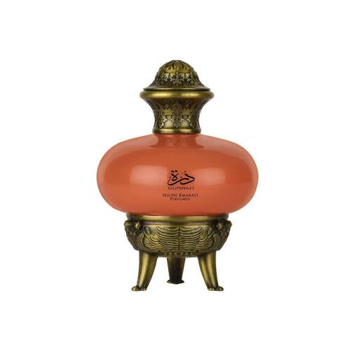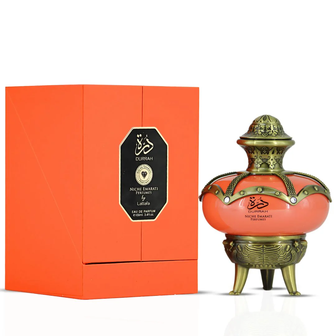 Durrah de Lattafa Perfumes é um perfume Floral Frutado Gourmet Compartilhável. As notas de topo são: Pêssego e Peônia. As notas de coração são: Osmanthus, Heliotrópio e Jasmim. As notas de fundo são: Almíscar e Patchouli.